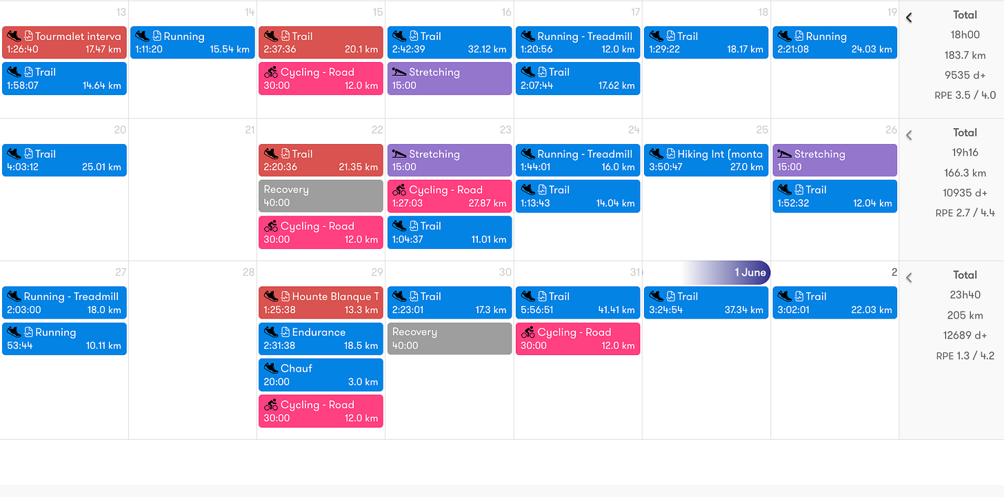 On the macro side I ramped vert from 6800m → 9500m → 11000m → 12700m and hours from 13h, 18h, 19h, 23h respectively. That’s a steep curve and not generally applicable. I intentionally did that because of the short interlude between races and to give myself a nice bookmark to return to post-Andorra.