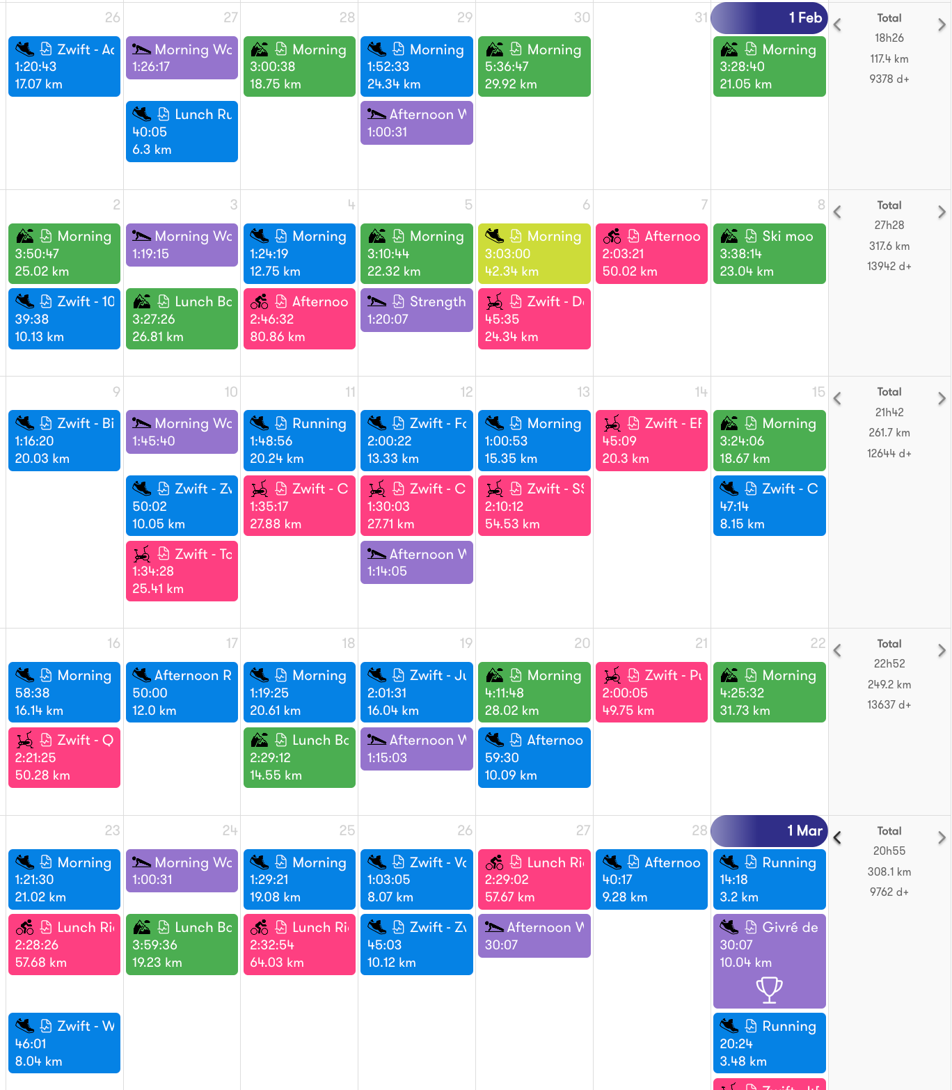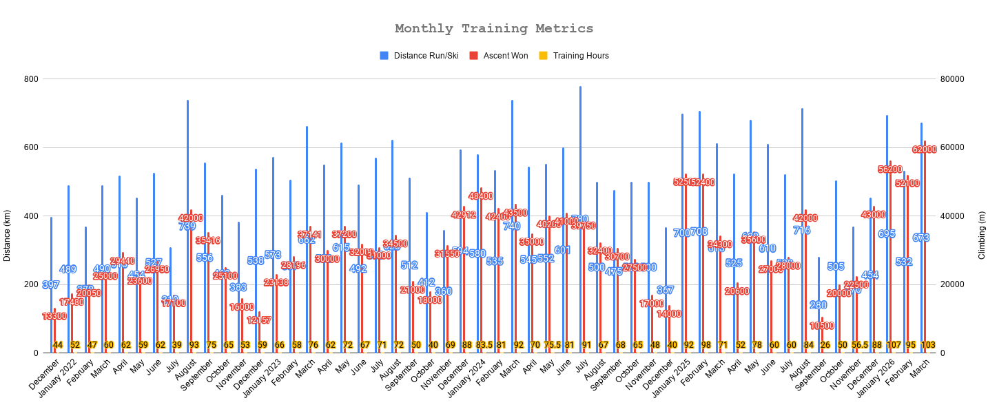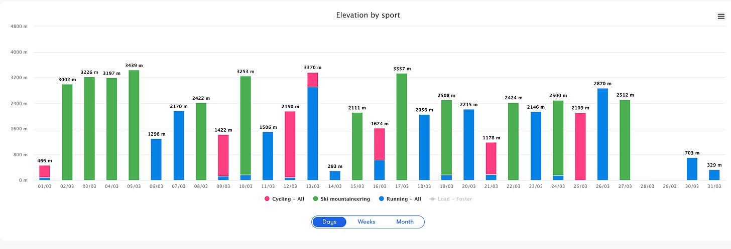 This flux—from expanding work capacity to stabilizing it—started to yield fitness in March. I returned to higher volume and was very consistent until the end of the month, when I caught a cold. During this time, I began transitioning to more running and am in the process of ramping kilometers and weekly descent.