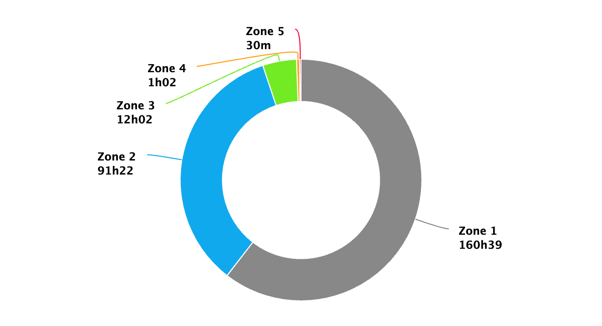 I stuck with base intensities, staying below my first ventilatory threshold (zones 1/2) for nearly every session. The distribution was roughly 2:1 (Z1:Z2), with about one hour of Z3 work regardless of total weekly volume.