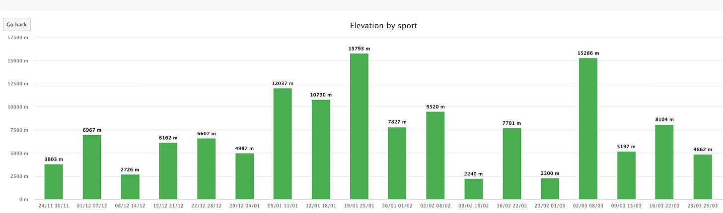 My overall goal was to build on previous winters and establish a higher physiological and psychological baseline for the season. Part of training is having faith in the work—trusting that at some future moment, it will pay off. For now, I can try to let go of my obsession with beaucoup and focus on preparing the body for the first race of the season: Transvulcania 70km.